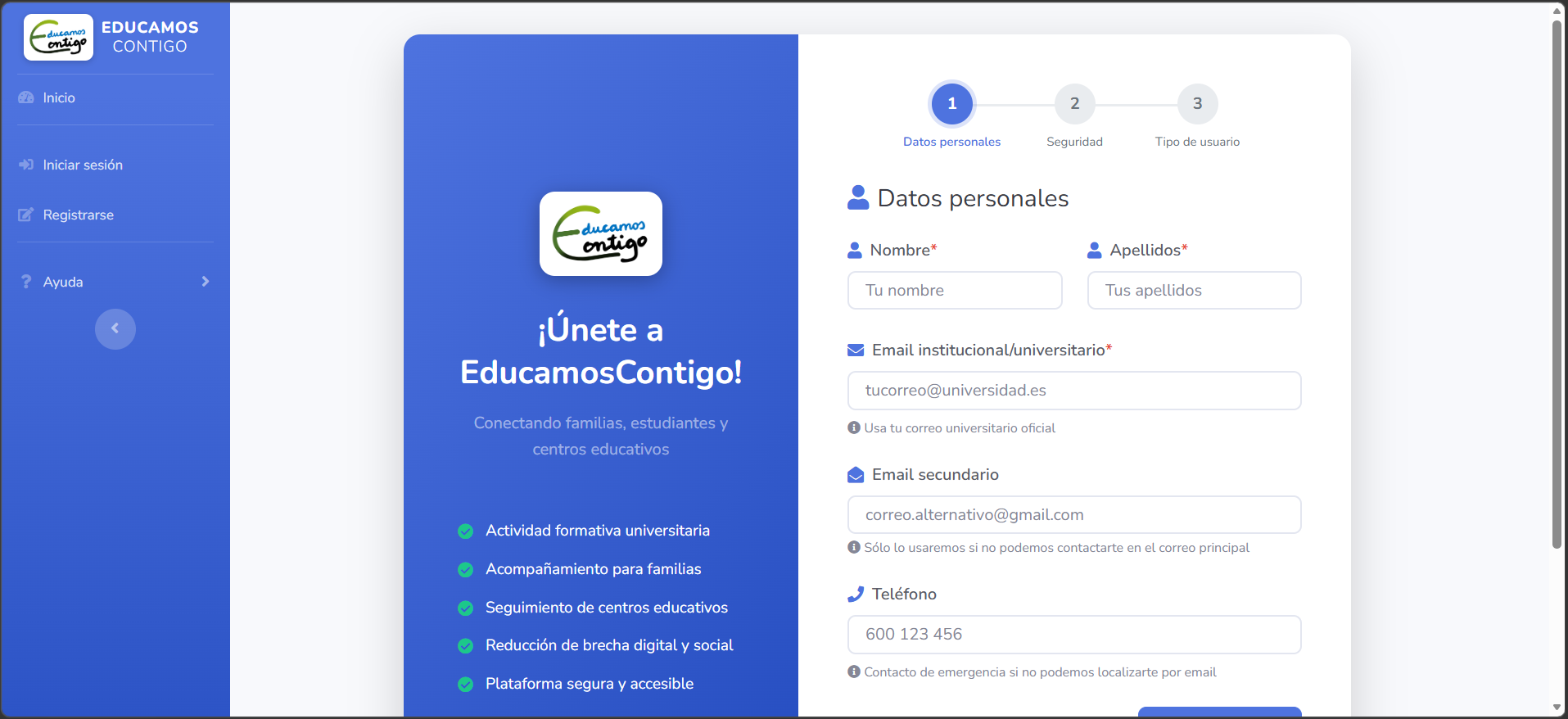 Se abrirá una página con diferentes pasos para completar el registro. Es importante incluir toda la información solicitada y seleccionar como tipo de usuario "Estudiantado universitario".